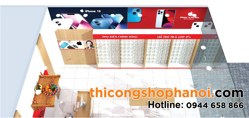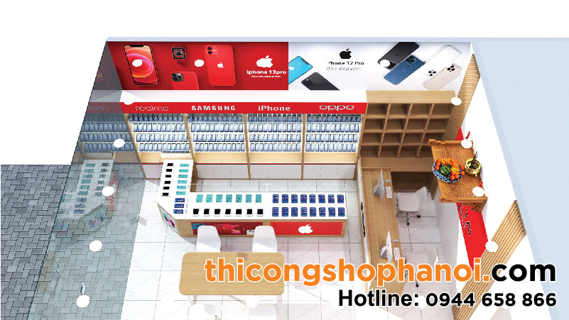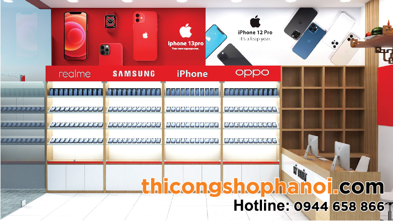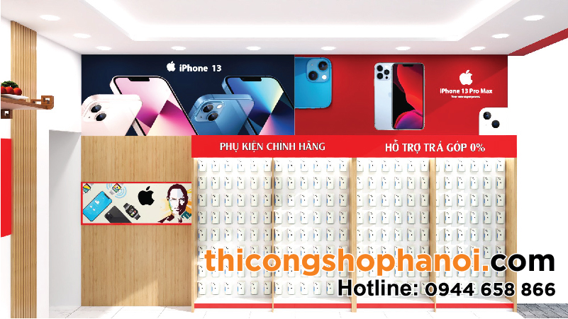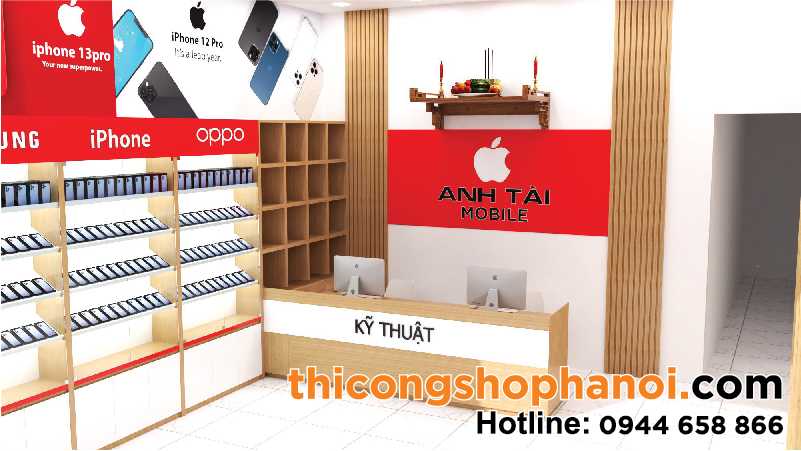 Thiết kế và thi công shop điện thoại Apple Anh Tài Mobile tông đỏ trắng