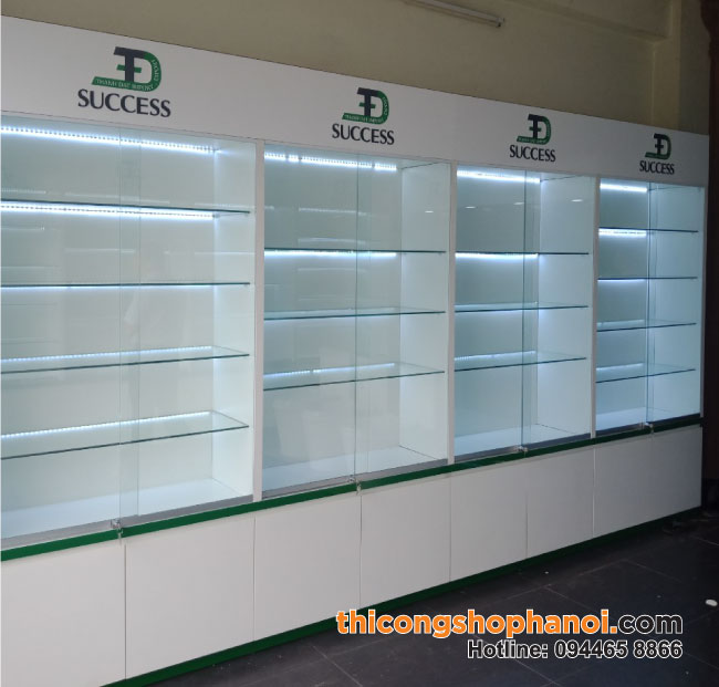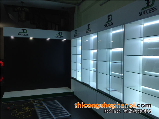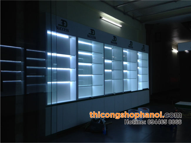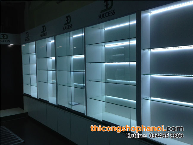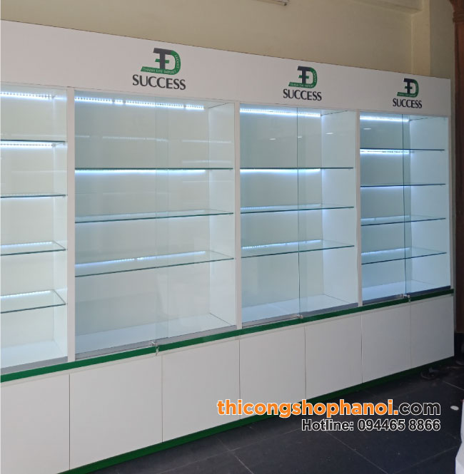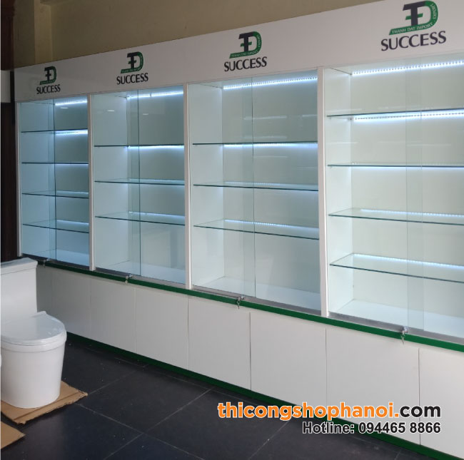 Showroom lấy màu trắng làm chủ đạo với 2 dãy kệ dài 5m, cao 2,3m, sâu 0,4m đầy đủ phụ kiện đi kèm như đèn LED giữa các đợt kính, logo sáng âm và trán, bục ốp mica xanh